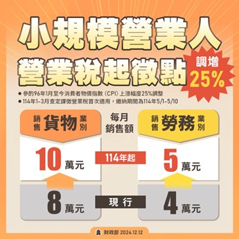 自114年1月1日起,買賣業等銷售貨物業別起徵點調高至每月銷售額新臺幣(下同)10萬元;裝潢業等銷售勞務業別起徵點調高至每月銷售額5萬元。